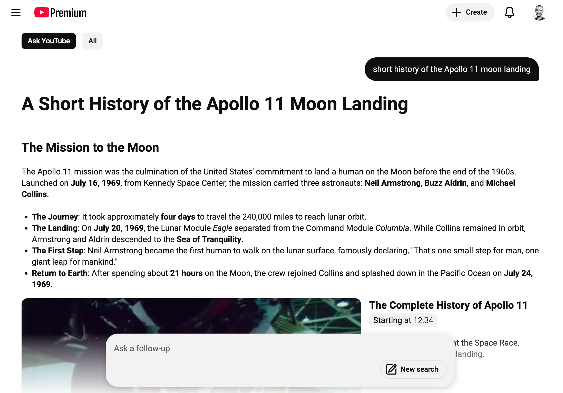 在结果页底部,系统会给出后续追问建议,例如“阿波罗 11 号的宇航员都有谁”“阿波罗 11 号阴谋论”等,并提供一个输入框方便继续提问或开始新的搜索。 点击“阿波罗 11 号的宇航员都有谁”后,页面会重新生成一套格式略有不同的结果,其中包括关于尼尔·阿姆斯特朗、巴兹·奥尔德林和迈克尔·柯林斯的背景介绍网格信息。 相比之下,以“阿波罗 11 号阴谋论”为关键词提问时,返回的则只是传统样式的 YouTube 搜索结果列表,而非 AI 生成页面。