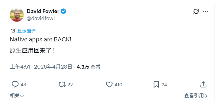 微软资深工程师David Fowler在社交平台发文称“原生应用回来了(Native apps are back)”,暗示Windows 11正在推进将应用逐步替换为原生实现。这是继今年早些时候微软Store和文件资源管理器架构师Rudy Huyn确认“微软计划为Windows 11构建100%原生应用”之后,又一位资深工程师释放的相同信号。